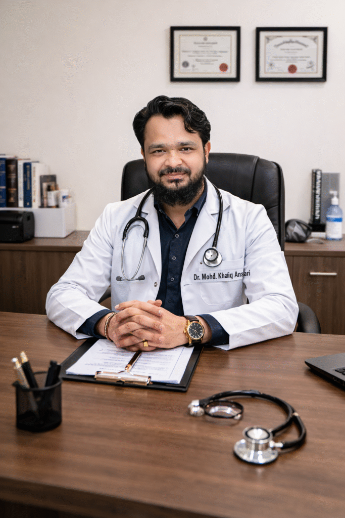 Dr. Mohd. Khaliq Ansari is a highly respected Physician and Critical Care Specialist, known for his exceptional skills and compassionate patient care. He completed his MBBS from King George’s Medical University (KGMU), Lucknow, and pursued his Anesthesia and Critical Care from Mumbai, building a strong foundation in diagnosing and managing complex medical conditions.